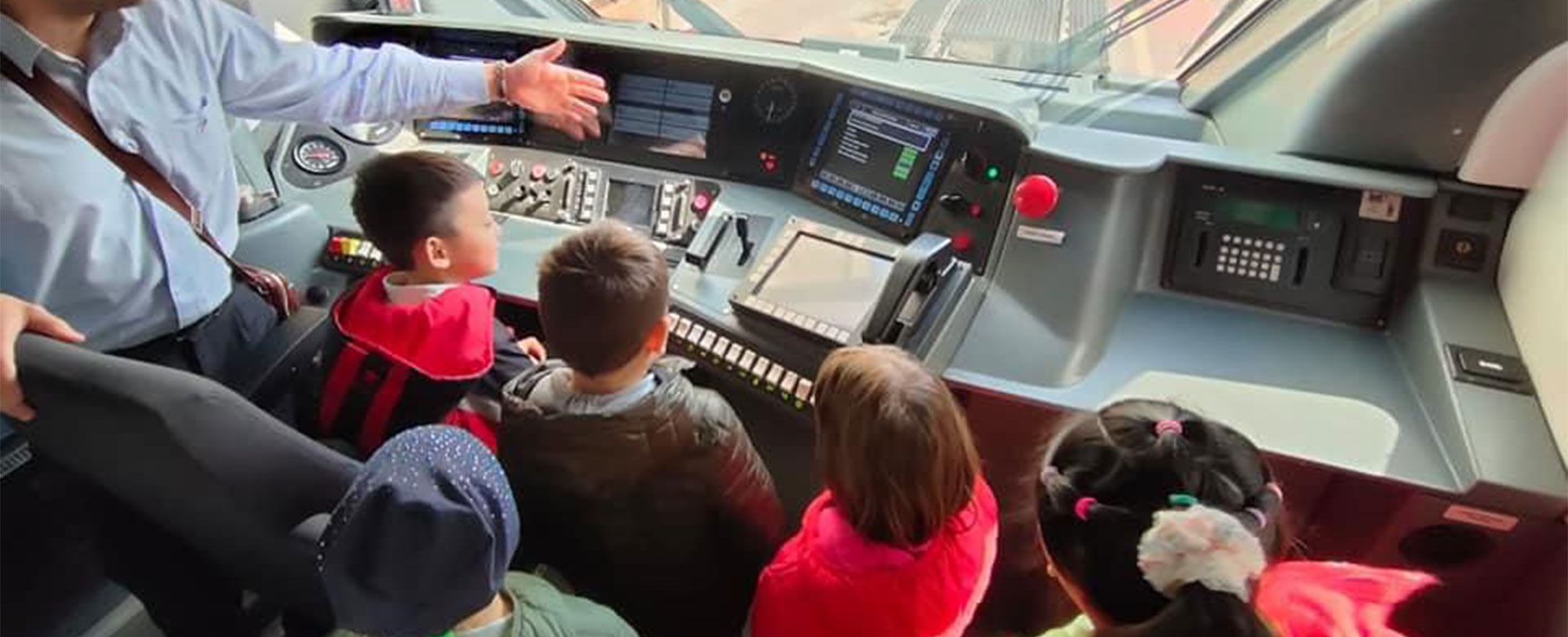 La visita ha previsto un benvenuto alla stazione di Porto San Giorgio - Fermo da parte del personale Trenitalia addetto all'assistenza clienti che ha poi accompagnato i giovanissimi passeggeri nel viaggio in treno, raccontando alcune pillole sull'attenzione necessaria da prestare sia in stazione sia a bordo. Accolti nella sala conferenze della stazione di Ancona dal Direttore della Direzione Marche di Trenitalia, Fausto Del Rosso, gli speciali viaggiatori hanno prima ammirato l'esposizione storica ferroviaria della Direzione e poi fatto ingresso nell'officina di manutenzione rotabili, dove hanno potuto osservare anche il sottocassa dei treni, adottando il punto di vista di un vero manutentore. Successivamente sono stati ospitati nelle cabine di guida di un treno Jazz e di un treno Pop, messi appositamente a loro disposizione, invitandoli simbolicamente ad aiutare il macchinista con il suono di una tromba. Tra la meraviglia e il divertimento, la giornata si è conclusa con una merenda e con i saluti del Direttore. Lo staff ha poi accompagnato i bambini a prendere il treno per rientrare a casa. A ciascuno di loro è stata consegnata una cornice personalizzata all'interno delle quale, al rientro a scuola, potrà disegnare il proprio ricordo dell'esperienza vissuta. Le insegnanti avranno cura di trasmetterne una copia alla Direzione Marche, così da poterle poi esporre in una bacheca apposita, come già fatto in precedenti visite di comitive scolastiche.