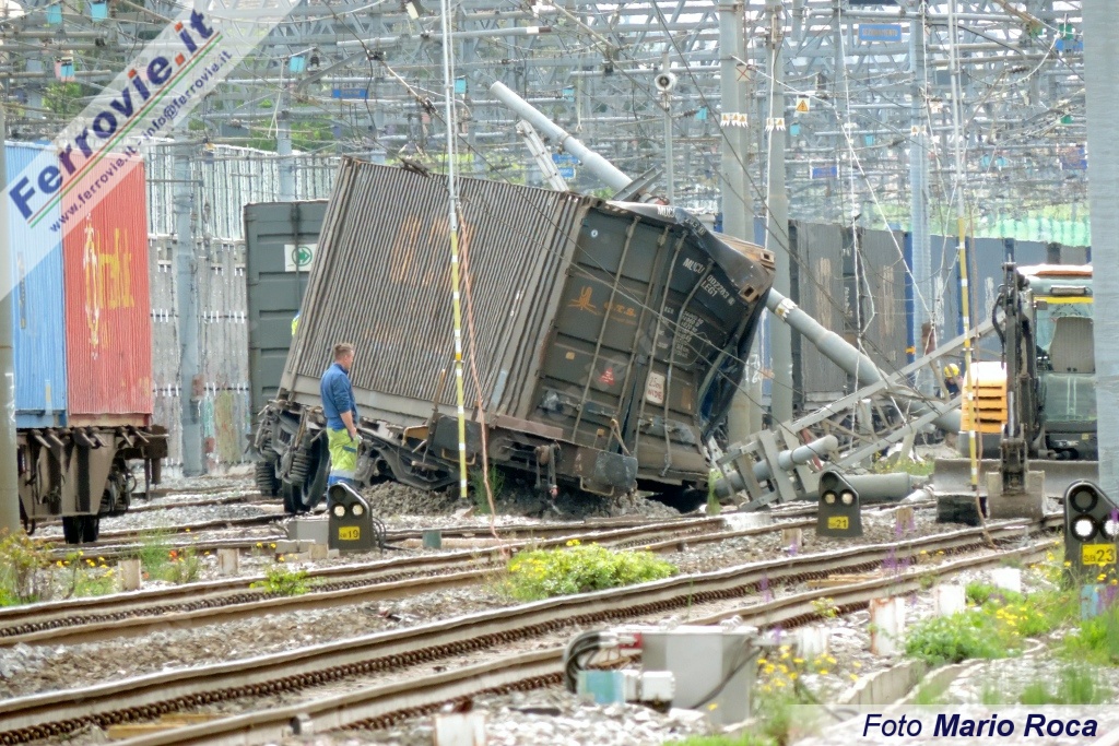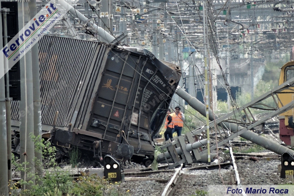 Nello specifico lo svio ha interessato solo una parte del terzo carro (trattasi di carro articolato pianale composto da due telai poggianti su tre carrelli) ed ha provocato il parziale rovesciamento dello stesso, con relativo abbattimento di alcuni tralicci che sostengono la linea aerea a copertura di sei binari paralleli. Il container presente sul carro non trasportava merce pericolosa ed è rimasto fortuitamente in sede.