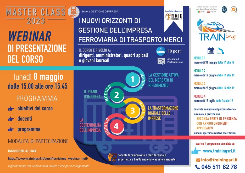 TRAINing ha organizzato un nuovo corso interattivo master class, "I nuovi orizzonti di gestione dell'impresa ferroviaria di trasporto merci" articolato su quattro moduli a partire dal 31 maggio prossimo.