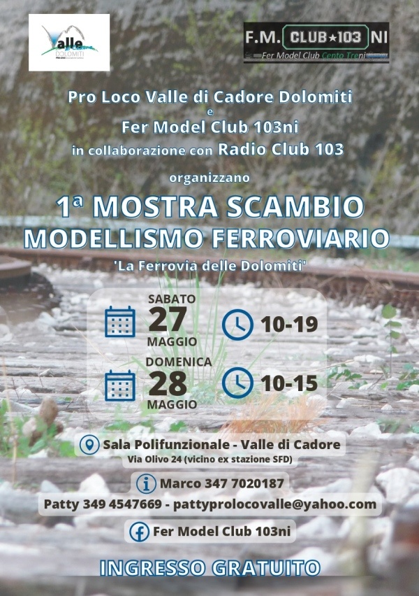 La Pro Loco Valle di Cadore Dolomiti e Radio Club 103, tramite il gruppo Fer Model Club 103ni, organizza la Prima Mostra Scambio di Modellismo Ferroviario "La Ferrovia delle Dolomiti".