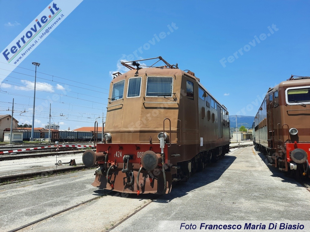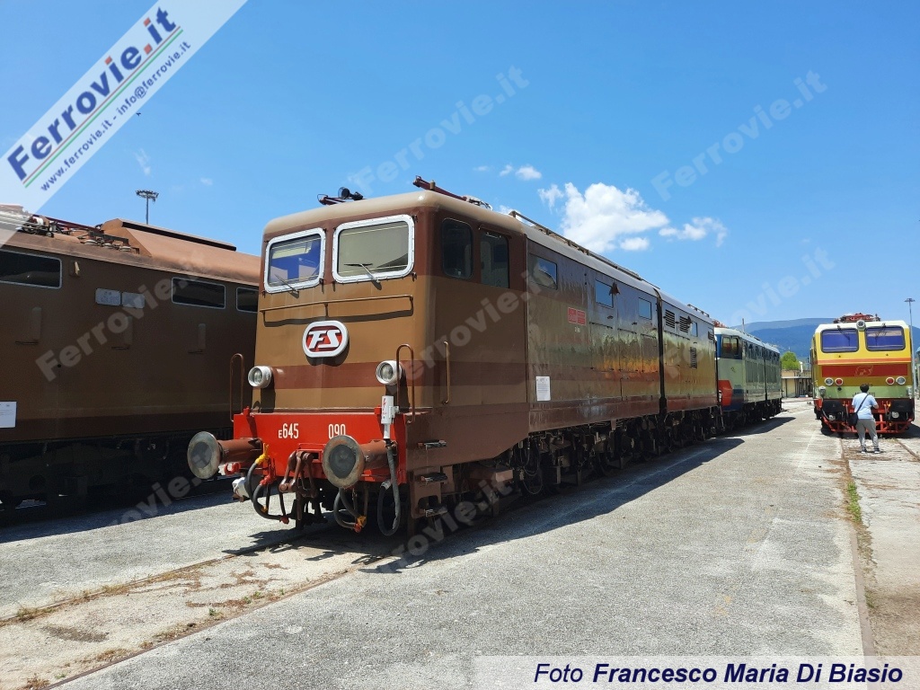 All'aperto, invece, facevano bella mostra di sé la locomotiva elettrica E.424.005, ultimo esemplare con motore a eccitazione composta, e la E.645.090, entrambe in livrea castano-Isabella, affiancate dalla E.491.011, ultima superstite di una serie di macchine destinate alla rete ferroviaria sarda e mai entrate in servizio.