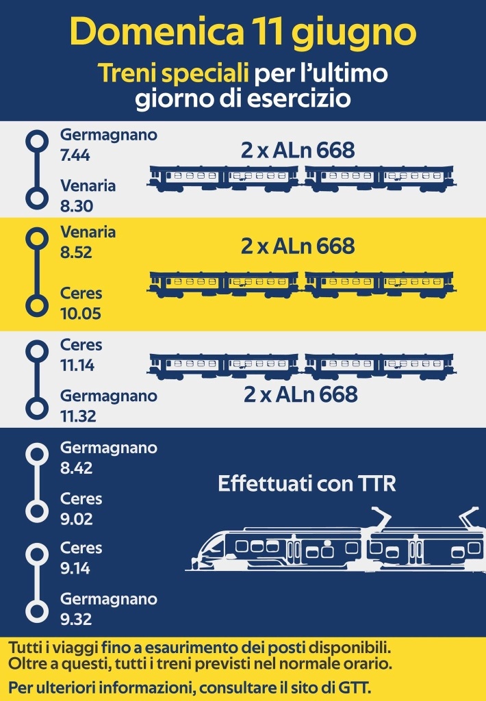 Per l'ultimo giorno di esercizio ferroviario della sua gestione, GTT Gruppo Torinese Trasporti ha previsto un programma speciale di treni: oltre alla normale programmazione dell'orario festivo, tre corse saranno effettuate con una doppia di ALn 668, mentre due corse mattutine vedranno eccezionalmente impiegati i TTR fino a Ceres.