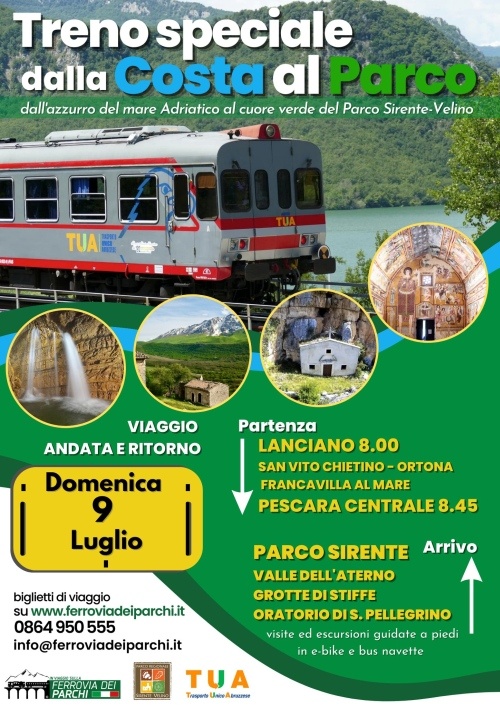 Domenica 9 luglio treno speciale diretto con gli "Aquilotti" di TUA, le scattanti e confortevoli ALn 776 che ci porteranno da Lanciano, dalla Costa dei Trabocchi e da Pescara fino ai luoghi più suggestivi del Parco Naturale Regionale Sirente Velino lungo la linea ferroviaria diretta a L'Aquila.
