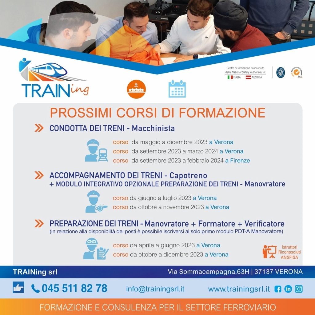 Per maggiori informazioni sui corsi TRAINing consulta il sito www.trainingsrl.it o contatta la Segreteria Tecnica al numero 045 511 82 78 o all'indirizzo e-mail info@trainingsrl.it.
