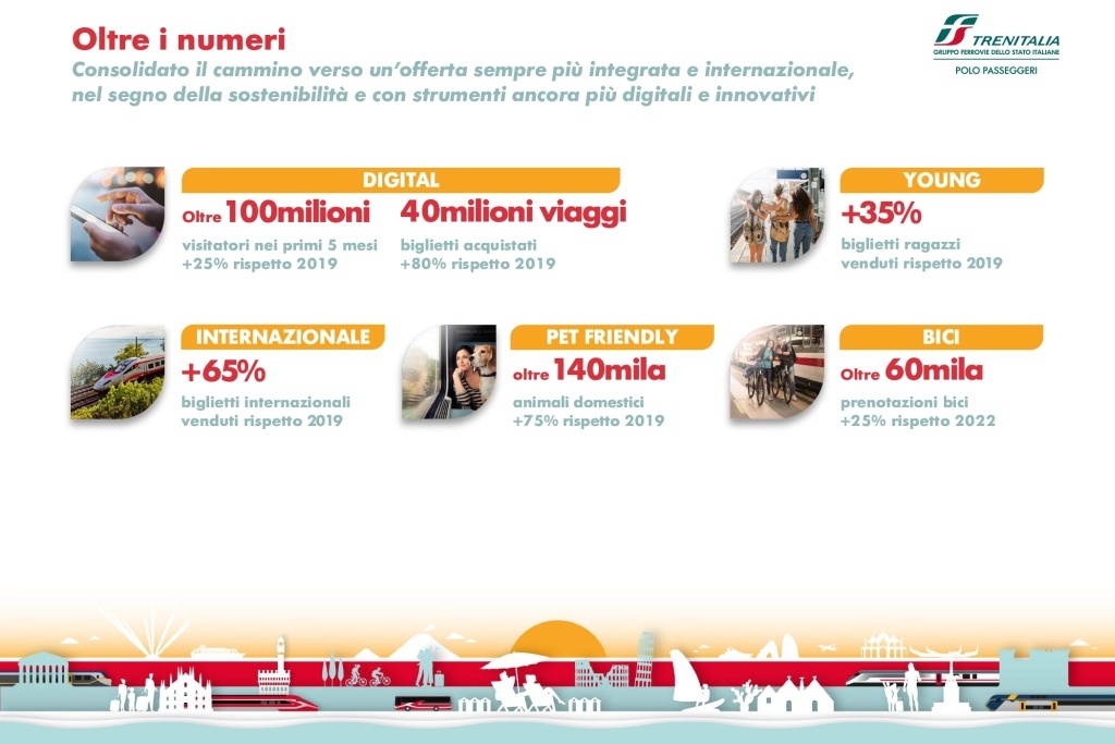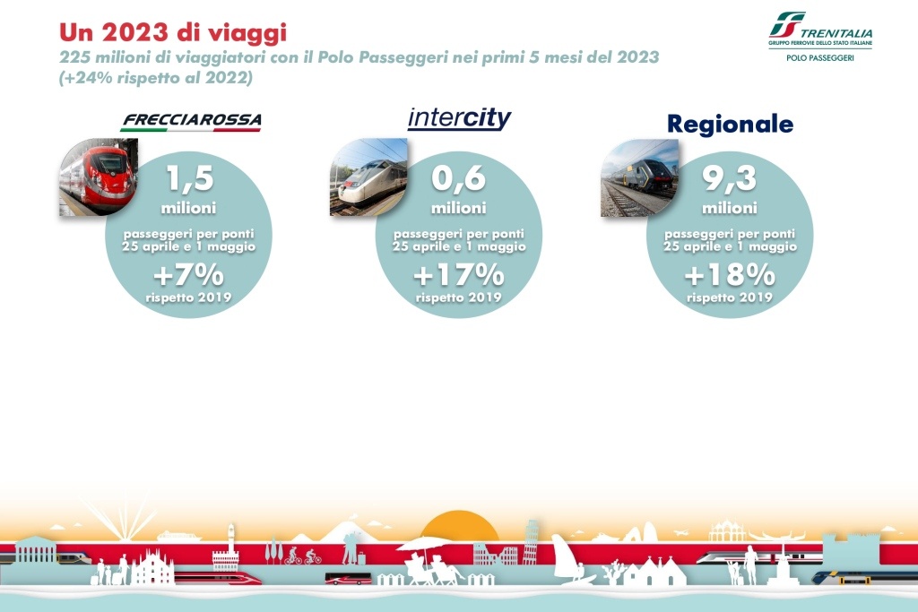 Nel 2023 le società del Polo Passeggeri del Gruppo FS hanno registrato 225 milioni di passeggeri nei primi 5 mesi (+24% rispetto al 2022). A livello nazionale sono state registrate ottime performance del Frecciarossa (1,5 milioni di passeggeri nei ponti del 25 aprile e del 1° maggio, +7% rispetto al 2019); degli Intercity (7,5 milioni di passeggeri al 31 maggio 2023, +10% rispetto al 2019) e del Regionale (oltre 9 milioni di viaggiatori nei ponti del 25 aprile e del 1 maggio: +18% rispetto al 2019). Le vendite a livello internazionale, ovvero i clienti che acquistano viaggi in Italia dall'estero, sono aumentate del 65% rispetto al 2019.