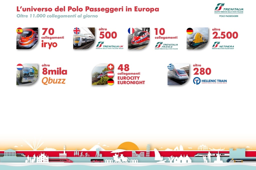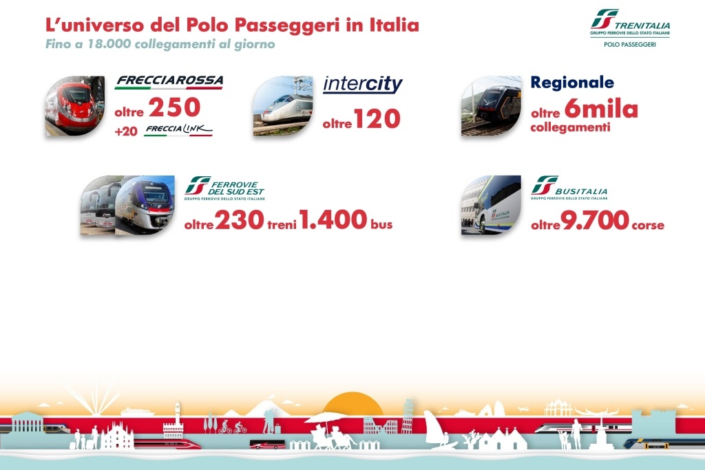 Frecce, Intercity, Regionale e FSE garantiranno in Italia oltre 6.600 collegamenti in treno, ai quali si aggiungono circa 11.000 corse bus di Busitalia e FSE. In Europa, nuovo mercato domestico del Gruppo FS, saranno oltre 3.300 i collegamenti complessivi al giorno in treno e 8.000 le corse bus.