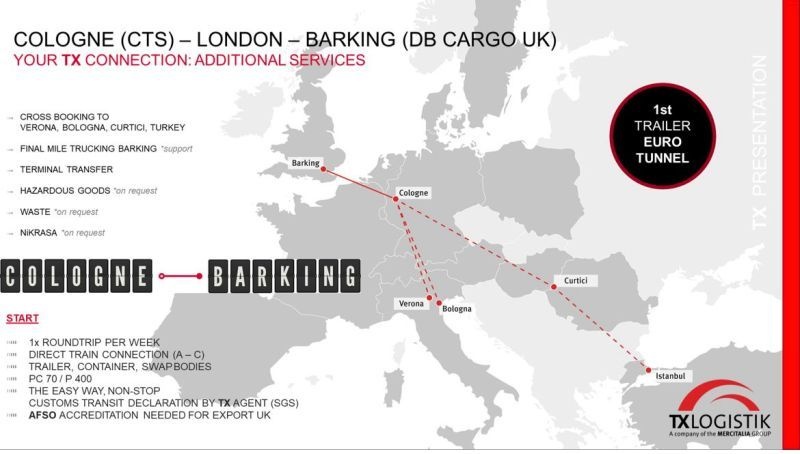Il 12 giugno parte il nuovo servizio ferroviario di TX Logistik tra Colonia (Germania) e Londra-Barking (Regno Unito).