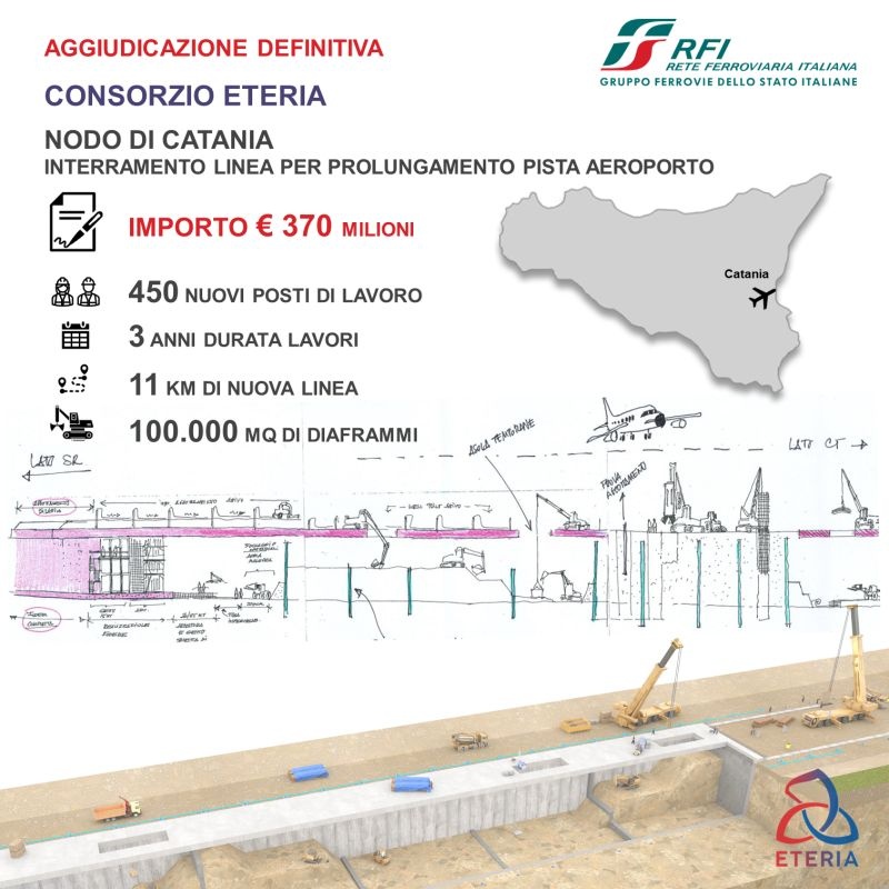 Il Consorzio Eteria l, capogruppo del raggruppamento di imprese composto da Euro Ferroviaria e Salcef del Salcef Group, si è aggiudicato l'appalto integrato di importo € 370.000.000 (progettazione + lavori + sicurezza) per la realizzazione delle modifiche alla infrastruttura ferroviaria siciliana necessarie a poter realizzare l'allungamento della pista dell'aeroporto di Fontanarossa e potenziare lo scalo aeroportuale.