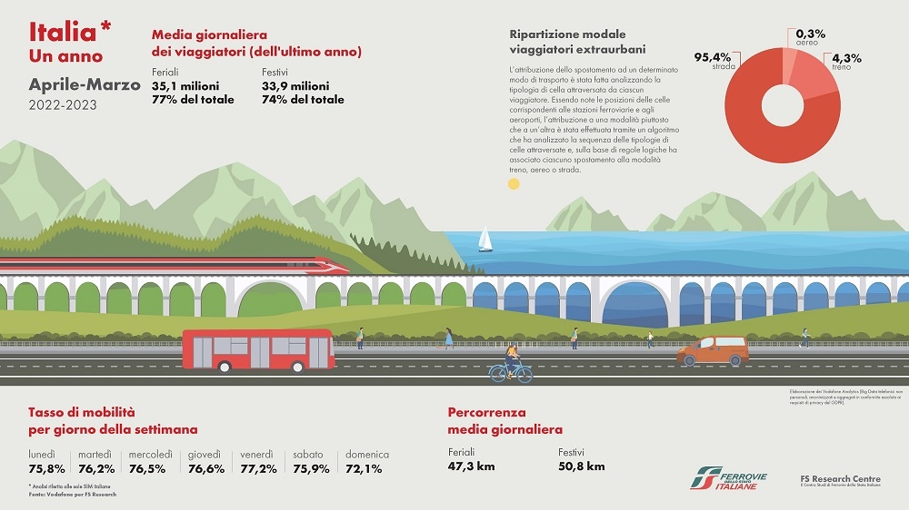 L'analisi di FS Research è stata condotta sulla base dei dati generati dalla rete Vodafone sulla base di circa 23 milioni di SIM, 200mila celle telefoniche dislocate sul territorio nazionale e 30 miliardi di posizioni giornaliere referenziate mappando la mobilità delle persone per diverse modalità di trasporto grazie proprio a questo lavoro congiunto del Gruppo Ferrovie dello Stato con Vodafone Business, con la start-up innovativa Motion Analytica e attraverso la piattaforma FS di Geospatial data intelligence che utilizza, appunto, i Big data telefonici. Il tutto raccogliendo in tempo reale i dati provenienti dalla rete mobile - non personali e anonimizzati nel pieno rispetto della normativa in materia di privacy - e assicurando informazioni temporali e spaziali molto precise.