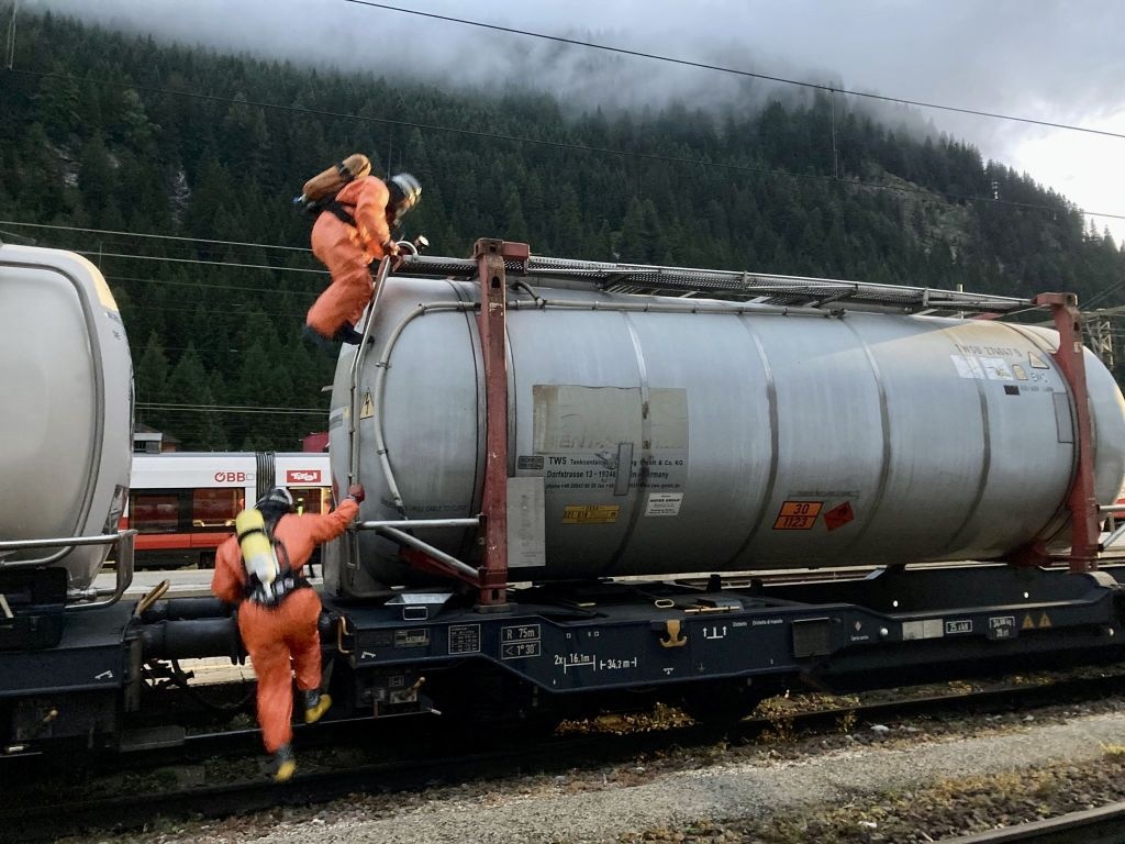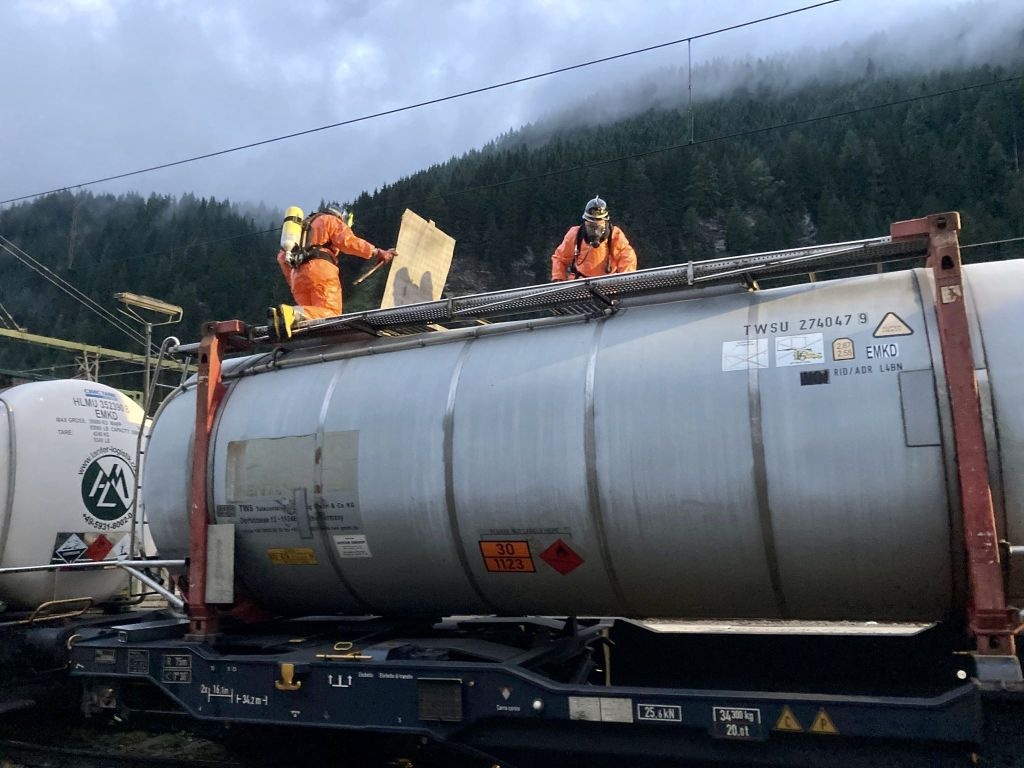 VVF Colle Isarco - 05.07.2023 - 03:42 - Intervento per fuoriuscita di un liquido infiammabile da vagone cisterna sulla ferrovia del Brennero. Utilizzando i dispositivi di protezione specifici, i Vigili del Fuoco hanno portato la situazione alla normalità in breve tempo. - In intervento con VVF Vipiteno, Unione Distrettuale Vipiteno e Polizia ferroviaria.