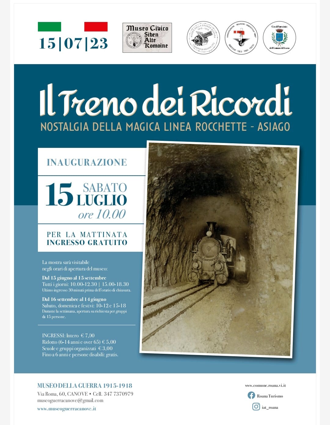 Sabato 15 luglio alle ore 10.00, presso il Museo della Guerra 1915-1918 a Canove di Roana (VI), sarà inaugurata la mostra "Il Treno dei Ricordi - Nostalgia della magica linea Rocchette - Asiago".