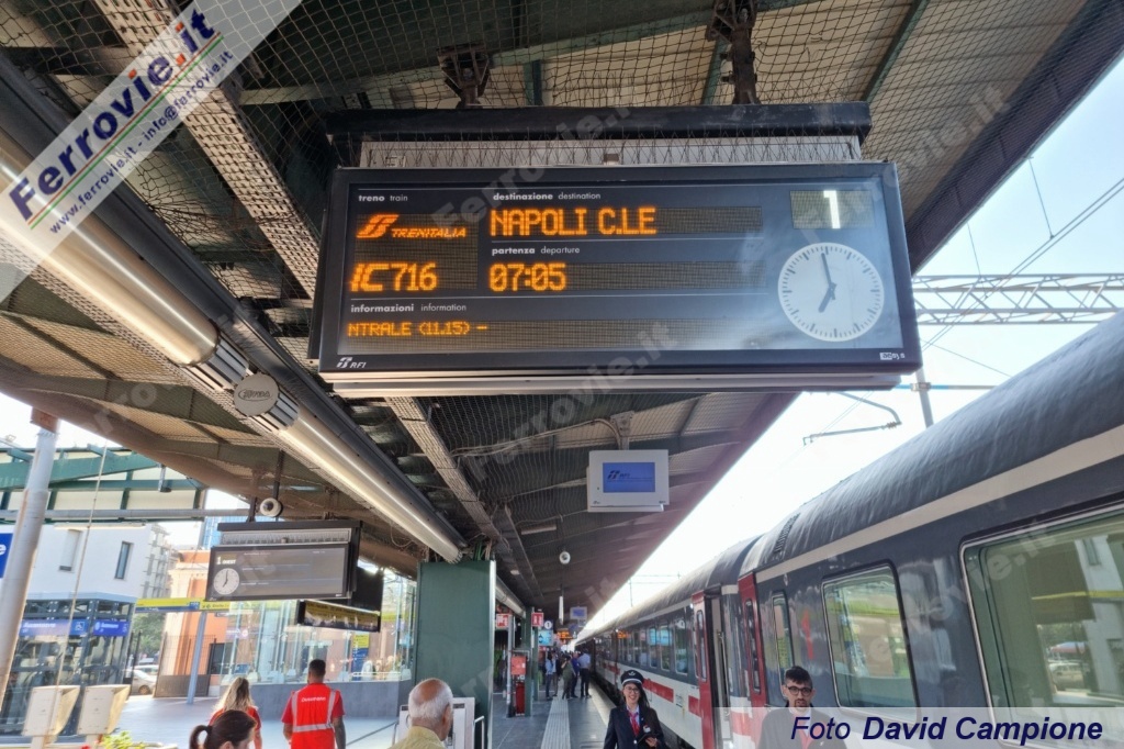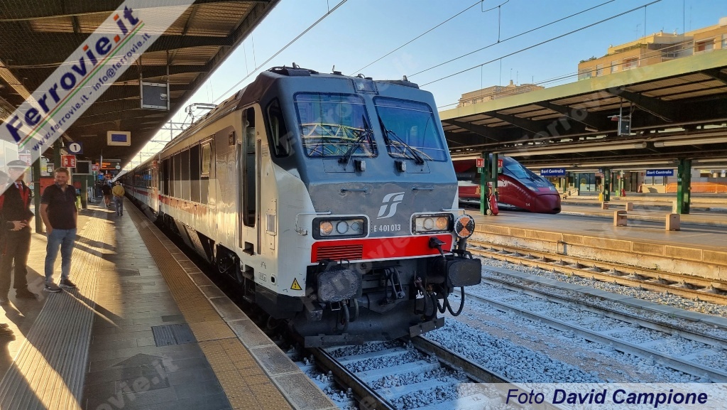 Il caldo sole di luglio inizia a far capolino tra le pensiline di Bari Centrale, quando in primo binario dal vicino deposito arriva il materiale per l'IC 716. Il convoglio si presenta con la consueta composizione dei treni Intercity: E.401.013 in testa, due ex Gran Confort di prima classe e sei carrozze ex Z1 di seconda classe tra cui la speciale (attrezzata per il trasporto di bici e distributori di bevande e snack) e a chiudere la pilotina Tipo Z1A. Il tutto in livrea omogenea bianca con fascia grigia. Sul marciapiede non mancano per l'occasione operatori e fotografi di giornali e TV private, mentre è assente il Sindaco di Bari Antonio Decaro.