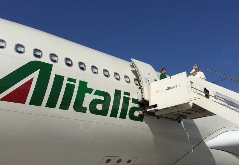 Per la prima volta il Santo Padre è stato accolto a bordo di uno dei nuovi aerei Alitalia, presentati lo scorso giugno a Roma, con un nuovo disegno della livrea e un nuova configurazione degli interni.