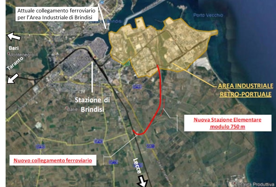 Inserito nell'ambito del più ampio progetto di realizzazione di un Hub interportuale di Brindisi, questo progetto prevede il completamento e l'attrezzaggio tecnologico della nuova stazione «Brindisi Intermodale» - che avrà 4 binari centralizzati a modulo 750 metri per arrivo e partenza di treni merci - e il collegamento ferroviario della nuova stazione con la linea Adriatica, tramite una nuova linea elettrificata a binario unico, con allaccio del nuovo Bivio (PC) «Brindisi Sud».