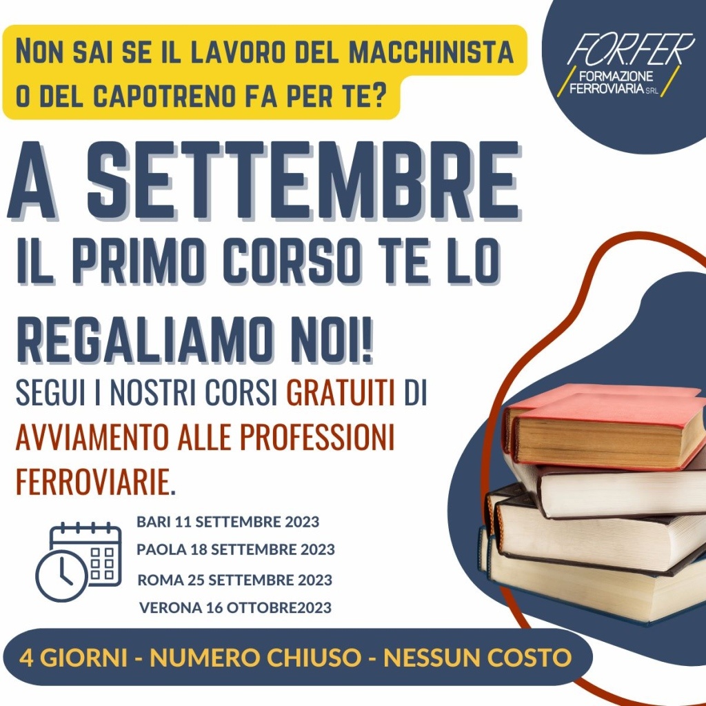 Per avere informazioni sui corsi a numero chiuso di avviamento a Capotreno, Macchinista e Preparatore del Treno, programmati per settembre a Roma, Bari, Paola e per ottobre a Verona: