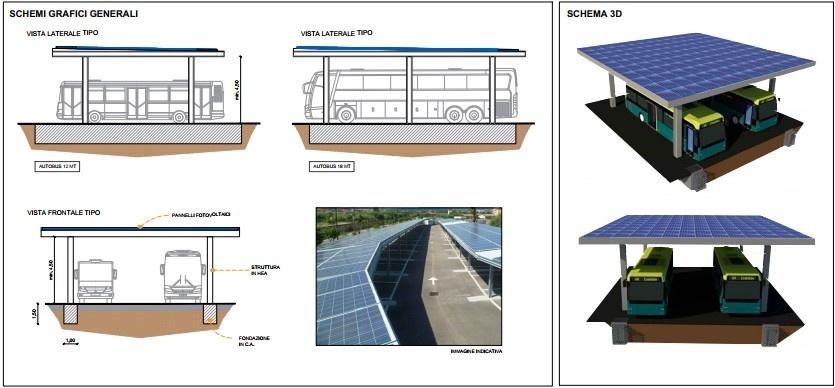 Gli stalli dei veicoli sono coperti con pannelli fotovoltaici.