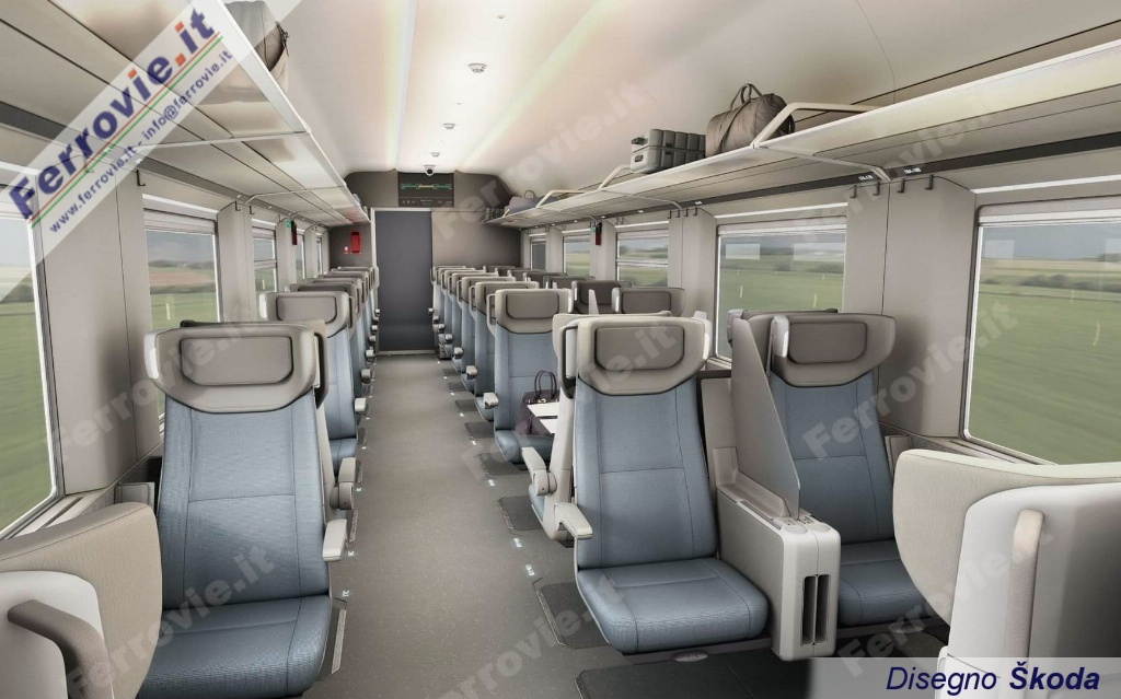 Le carrozze "con posti a sedere" offriranno un ampio salone con sedili 2+1, toilette per ciascun lato, bagagliere nella zona vestiboli e spazi appositi per biciclette.