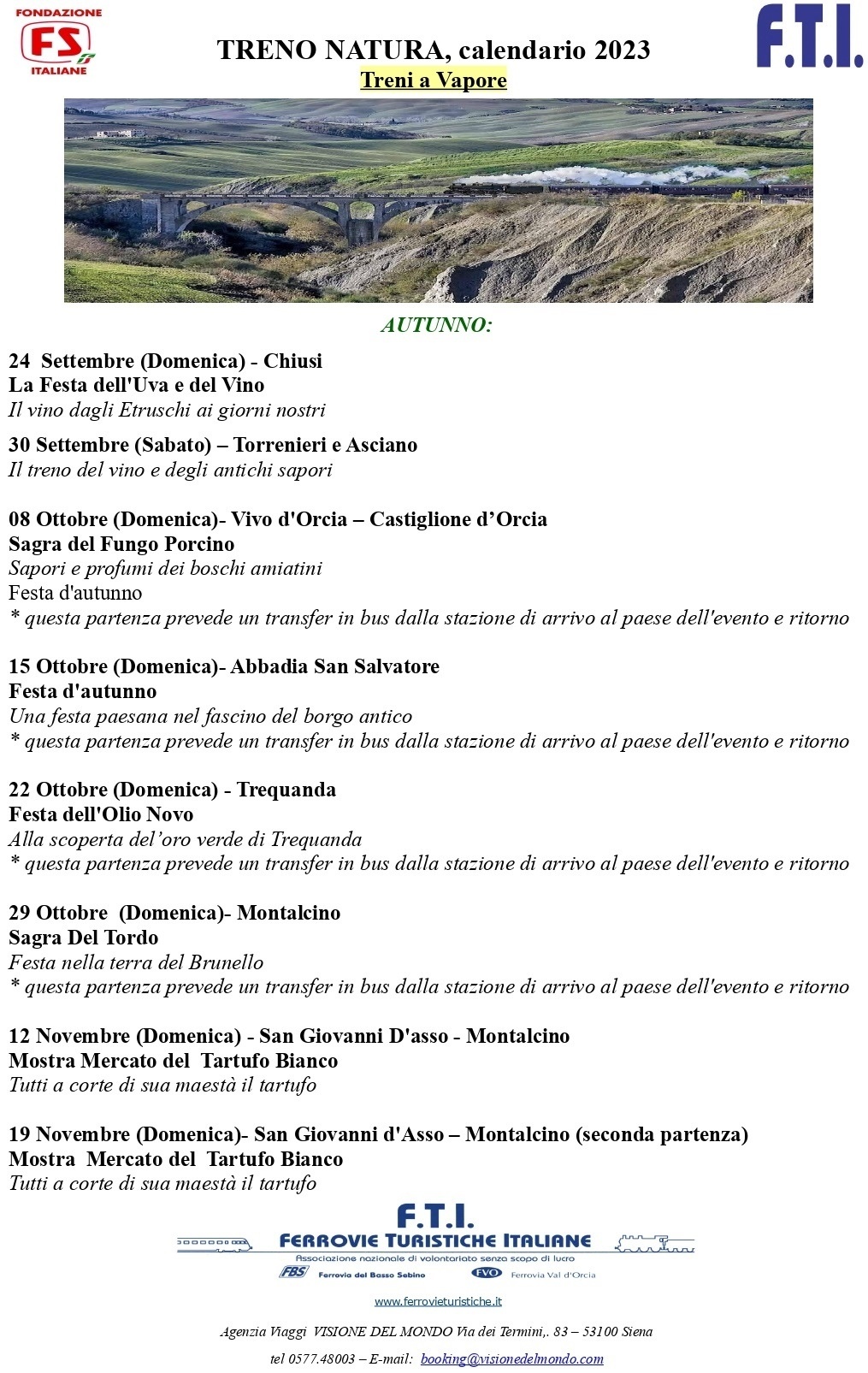 FTI - Ferrovie Turistiche Italiane ha pubblicato il calendario dei viaggi del Treno Natura, treni storici a vapore da Siena immersi nella splendida natura della Toscana.