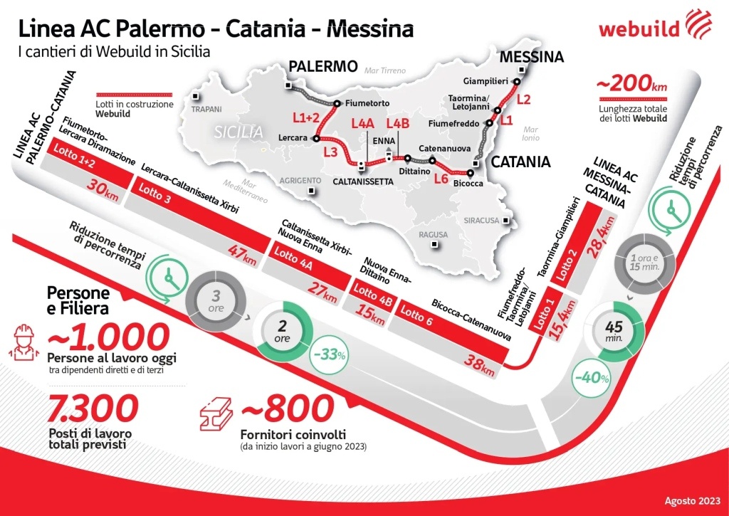 , sulla linea Palermo-Catania sta realizzando le tratte e , a cui si sono aggiunte più di recente la e la , mentre sulla linea Messina-Catania, sta realizzando i lotti e . Nel complesso, la costruzione di questi sette lotti si stima porterà alla creazione di 7.300 posti di lavoro, tra diretti e di terzi, con il coinvolgimento da inizio lavori ad oggi di circa 800 imprese.