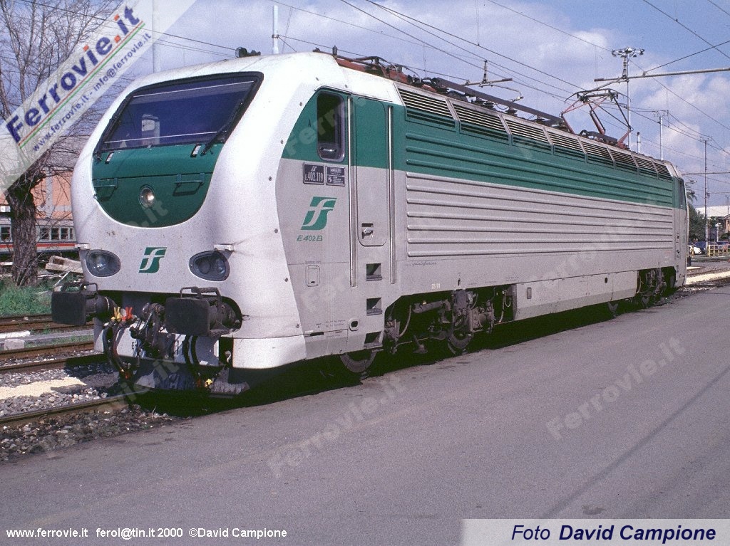Ripresa nel deposito di Roma San Lorenzo, la E.402B.119 attende l'apertura del segnale basso per trasferirsi nella vicina stazione Termini, dadove prenderà servizio alla testa di un treno Intercity. (Foto David Campione, 7 marzo 2000)