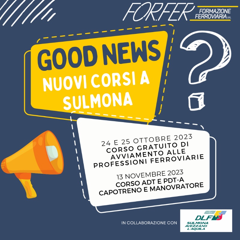 Non è mai troppo presto per decidere del proprio futuro, e per aiutare chi desidera entrare rapidamente nel mondo del trasporto su ferro. For.Fer, in collaborazione con DLF - Associazione Dopolavoro Ferroviario di Sulmona, Avezzano e l'Aquila, propone anche a Sulmona per l'autunno 2023 un inedito Corso ADT e PDT-A - capotreno e manovratore.