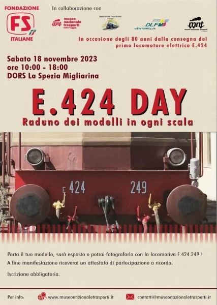 Sabato 18 novembre presso il DORS di Fondazione FS Italiane di La Spezia Migliarina si terrà il "E.424 Day", raduno dei modelli in ogni scala di questa locomotiva delle FS.