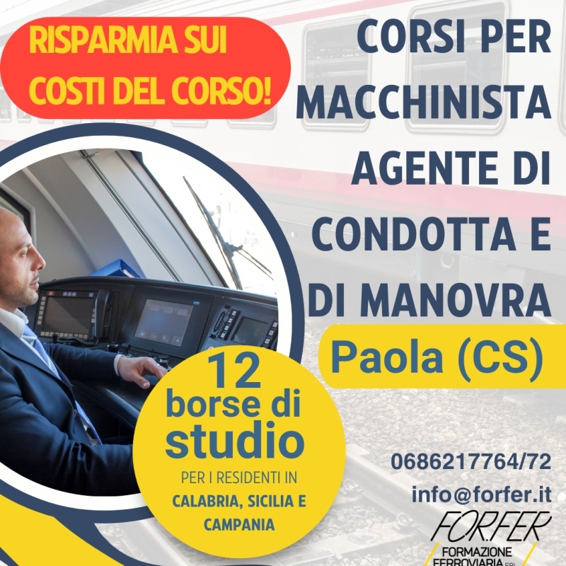 Grazie al sostegno dalle aziende Ferrotramviaria, Ferrovie del Gargano e SSIF per il prossimo corso della sua sede di Paola, For.Fer mette a disposizione dei residenti in Calabria, Sicilia o Campania 12 borse di studio che permetteranno di coprire metà del costo dei corsi per diventare Macchinista agente di condotta e Macchinista di Manovra.
