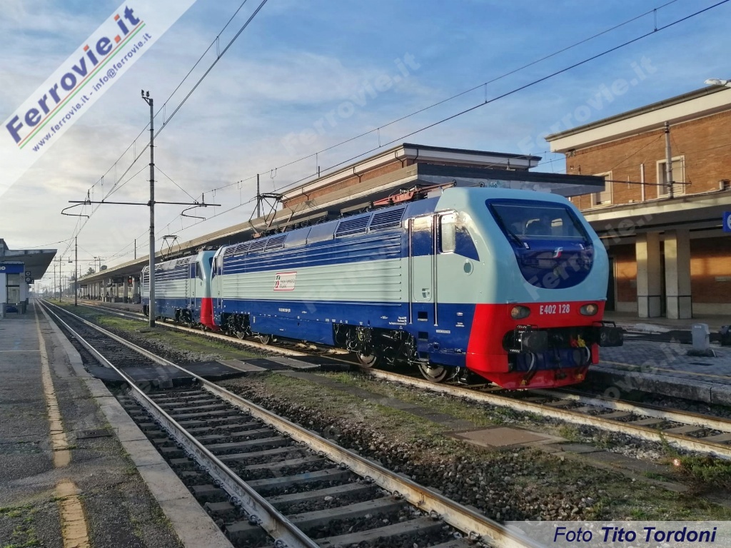 FOLIGNO (Perugia) - Ancora una E.402 per Treni Turistici. Dopo le E.402.116 e 172, quest'ultima attualmente nelle Officine di Foligno, nelle prime ore di domenica 19 novembre la E.402.128 in livrea TTI ha lasciato l'impianto di manutenzione Trenitalia di Foligno e con essa la E.402.116.