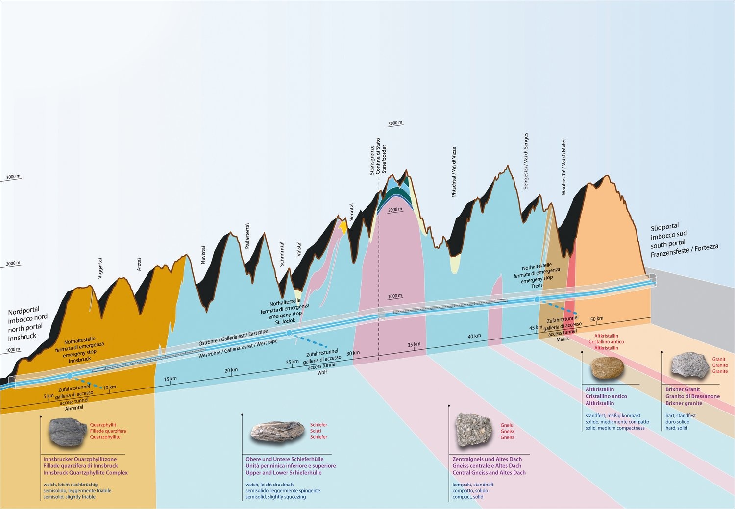 Com'era già previsto all'inizio del progetto, la geologia dell'area del cantiere di Mules, a sud dello gneiss centrale, è molto complessa. La fresa meccanica attraversa tipologie di rocce molto diverse (scisti, filladi, quarziti, marmi e orizzonti di carniole, solo per menzionarne alcune) ad intervalli molto brevi.