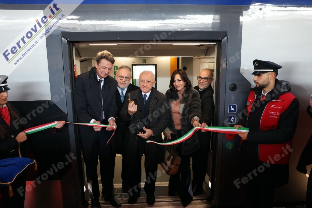 A presentare i nuovi treni Rock, questa mattina alla Stazione Centrale di Napoli, il Presidente della Regione Campania Vincenzo De Luca, il Presidente della Commissione Trasporti Luca Cascone e l'Amministratore Delegato di Trenitalia Luigi Corradi. Presente il Direttore Regionale Trenitalia Campania, Mario Cuoco.