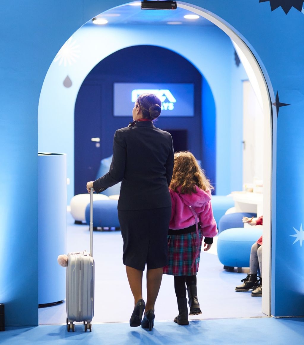 Nel concept creativo della nuova Lounge Fantasia, cielo e mare si fondono per creare un luogo vestito con l'azzurro ITA Airways e giochi di illustrazioni che evocano un'atmosfera divertente e sognante. L'identità visiva del brand ITA Airways ha guidato l'ideazione dello spazio, dove gli asset proprietari e distintivi di marca sono declinati in modo coerente e armonioso. Elemento centrale è rappresentato da una grande mongolfiera, circondata da nicchie a forma di oblò e accoglienti salottini ispirati al design aeronautico. Qui, i piccoli viaggiatori possono rilassarsi e divertirsi, immersi in un'atmosfera che li invita a esplorare e sognare grazie a giochi dedicati a ogni fascia di età. Ogni dettaglio è curato con attenzione per garantire un'esperienza unica, in cui il viaggio diventa un'avventura italiana indimenticabile ancora prima di salire in alta quota.