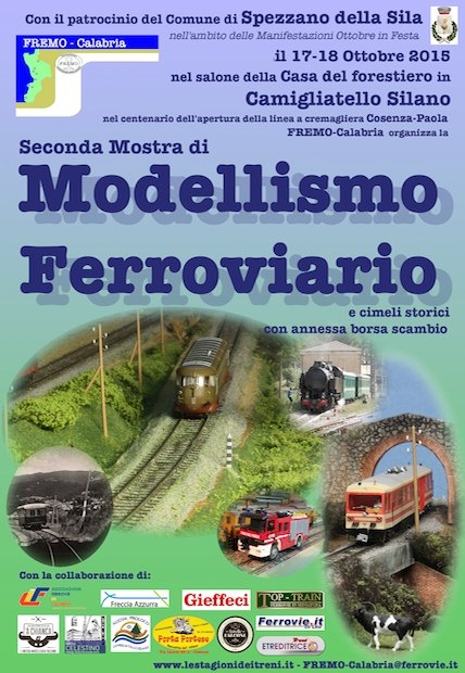 CAMIGLIATELLO SILANO (Cosenza) - Con il patrocinio del Comune di Spezzano della Sila, nell'ambito delle manifestazioni Ottobre in Festa, FREMO-Calabria organizza per il 17-18 ottobre 2015 - ore 10-19 la seconda Mostra di Modellismo Ferroviario e cimeli storici con annessa borsa scambio.