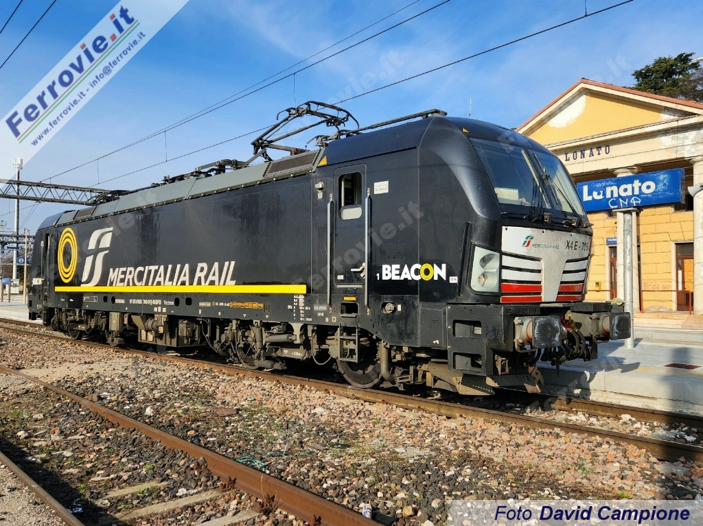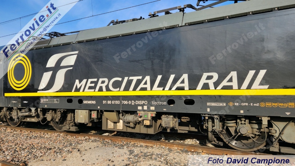 È il caso della E 193.706 dove la vistosa scritta bianca "MERCITALIA RAIL" e logo FS sulla fiancata vanno a coesistere con gli altrettanto vistosi tre cerchi gialli con la riga dello stesso colore che sono appunto il logo di Beacon Rail di recente applicazione.