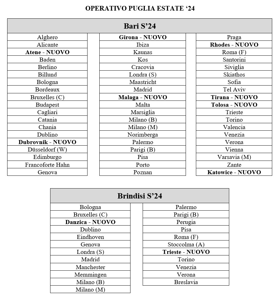 • 80 rotte totali (57 a Bari e 23 a Brindisi)