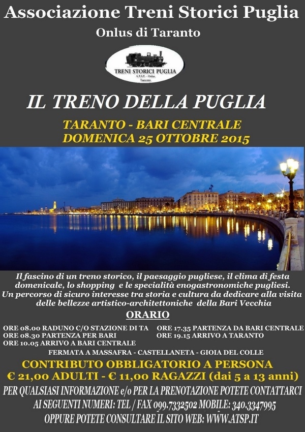 Con questo treno, che segue quello di domenica 18 ottobre 2015 "Il Treno delle Castagne" Taranto-Melfi (vedi Treni storici del 20/10/2015), riprendono in Puglia dopo circa due anni l'effettuazione dei Treni d'epoca grazie alla Direzione di Ferrovie dello Stato Italiane e
