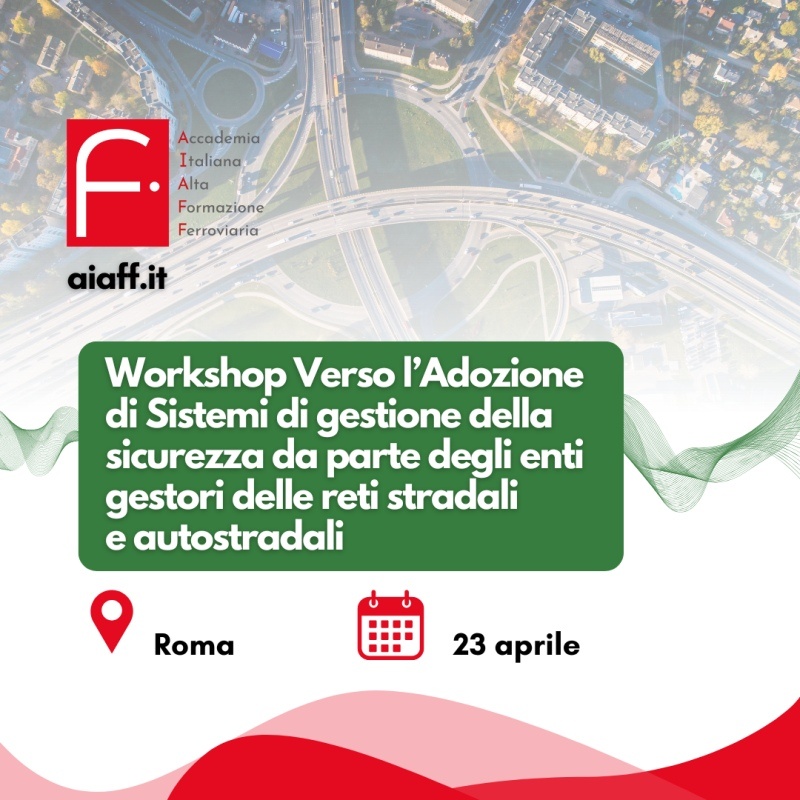 L'Accademia Italiana di Alta Formazione Ferroviaria (AIAFF) organizza in presenza a Roma il 23 aprile 2024, dalle 09:00 alle 16:00, il workshop "Verso l'adozione di Sistemi di Gestione della Sicurezza da parte degli enti gestori delle reti stradali e autostradali".