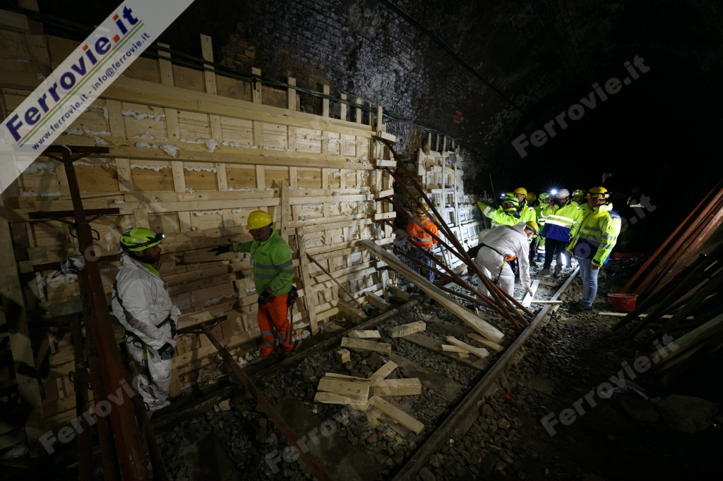 In galleria i tecnici stanno lavorando per proteggere la base del pozzo di areazione e procedere al successivo tombamento. Gradualmente si sta procedendo alla realizzazione di una parete di calcestruzzo armato alla base del pozzo, in modo da isolare e proteggere il sedime ferroviario.