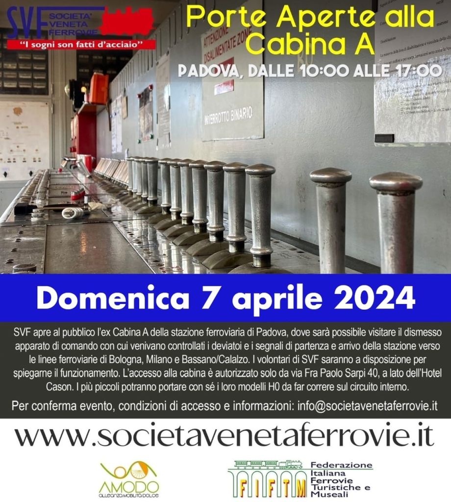 L'associazione Società Veneta Ferrovie APS aprirà, domenica 7 aprile dalle 10:00 alle 17:00, l'ex cabina A della stazione di Padova (Via Fra' Paolo Sarpi, 40); cabina che fino al 2005 governava il traffico in direzione di Bologna, Milano, Bassano del Grappa e l'ingresso verso il deposito locomotive attraverso i suoi apparati elettromeccanici, che un gruppo di volontari sta rimettendo in funzione e che, attraverso alcuni relè e un'apparecchiatura elettronica, simulano il traffico sulla rete e interagiscono con il quadro sinottico che riproduce il piano della stazione.