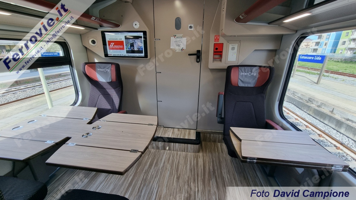 Alle 17.17, con 8 minuti di ritardo, l'HTR.412-033 fa il suo ingresso a Catanzaro Lido. Il materiale si presenta privo dei pittogrammi con le indicazioni di classe, ma saliti a bordo possiamo subito constatare che i posti di prima classe sono in coda. Nonostante il convoglio disponga di entrambe le classi, in fase di acquisto del biglietto attualmente è possibile optare solo per la seconda essendo il materiale in turno promiscuo con le composizioni ordinarie appunto di sola seconda classe.