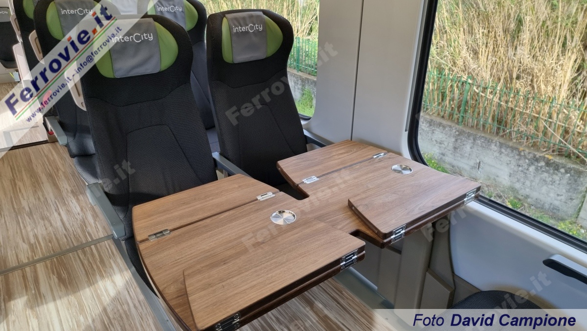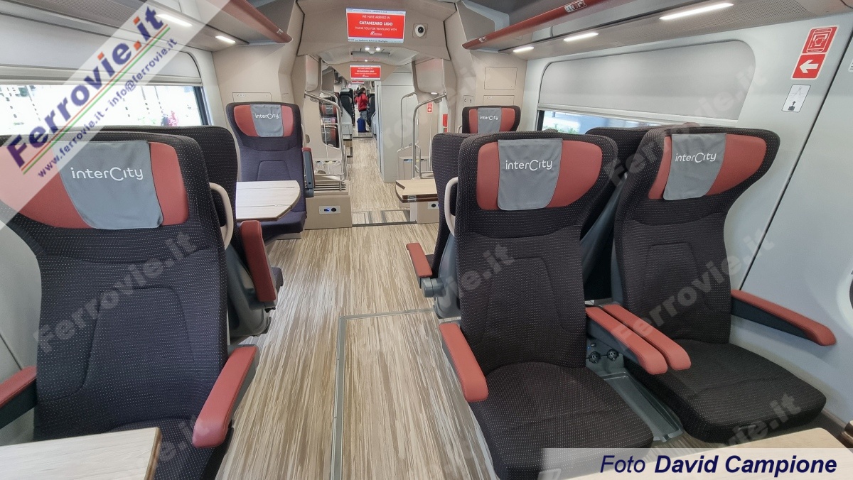 Con un'accelerazione decisa il 566 riprende quindi il suo viaggio verso Reggio Calabria. La sostanziale differenza tra gli HTR.412 per la Divisione Business Regionale e Intercity è negli arredi interni. Nel caso dell'HTR.412 Intercity le poltrone sono di disegno diverso con rivestimento in tessuto (anziché plastico); poggiatesta e braccioli presentano inoltre colori differenti a seconda delle classi (amaranto per la prima e verde per la seconda classe). Tutte le poltrone dispongono di un comodo tavolino con anta apribile, prese di corrente a 220 V e USB e la maggior parte di esse sono con il modulo vis-a-vis e in buona parte allineate ai finestrini. Non mancano alcuni posti con vista sul montante e addirittura un posto di prima classe "chiuso" da parete sia lateralmente che frontalmente. Diverso anche il rivestimento della pavimentazione rispetto ai Blues della Regionale, qui in materiale plastico che riproduce un pavimento in legno.