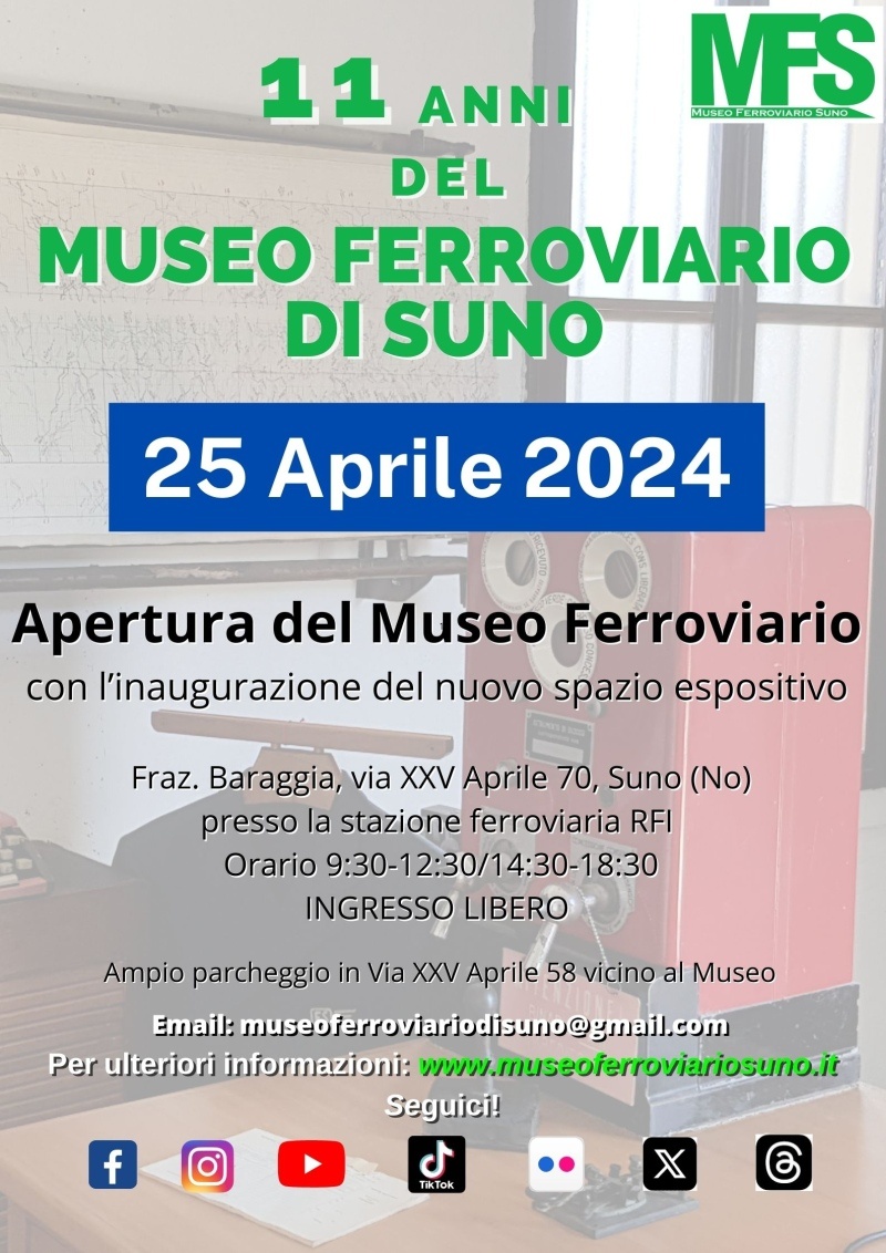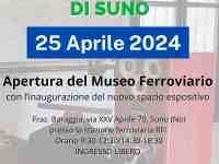 Giovedì 25 aprile 2024 si terrà l'apertura ordinaria del Museo Ferroviario di Suno per l'11° anniversario dell'inaugurazione del museo, con orario al pubblico 9:30-12:30 / 14:30-18:30.