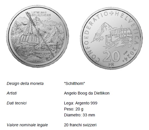 La moneta speciale «Cabinovia Schilthorn» è realizzata in argento 999 e pesa 20 g. Sul dritto sono raffigurati la vecchia cabinovia ancora esistente e il ristorante girevole di fama mondiale «Piz Gloria» a 2970 metri sul livello del mare, da cui è possibile ammirare il panorama mozzafiato dell'Eiger, del Mönch e della Jungfrau. Il rovescio mostra uno schizzo dello Schilthorn e del ristorante: un must per ogni collezionista e amante delle monete svizzere, dei film di James Bond e delle montagne svizzere. Vi è raffigurato anche il valore nominale di 20 franchi svizzeri. La moneta è emessa in una tiratura di 3300 pezzi nella qualità «fondo specchio» in astuccio, 200 pezzi in «fondo specchio» in astuccio con certificato dell'artista e 5000 pezzi in qualità «non messa in circolazione» in un blister. Inoltre, per completare questa superba serie sulle cabinovie, vengono prodotti due cofanetti di monete, ciascuno numerato in edizione di 500 esemplari.