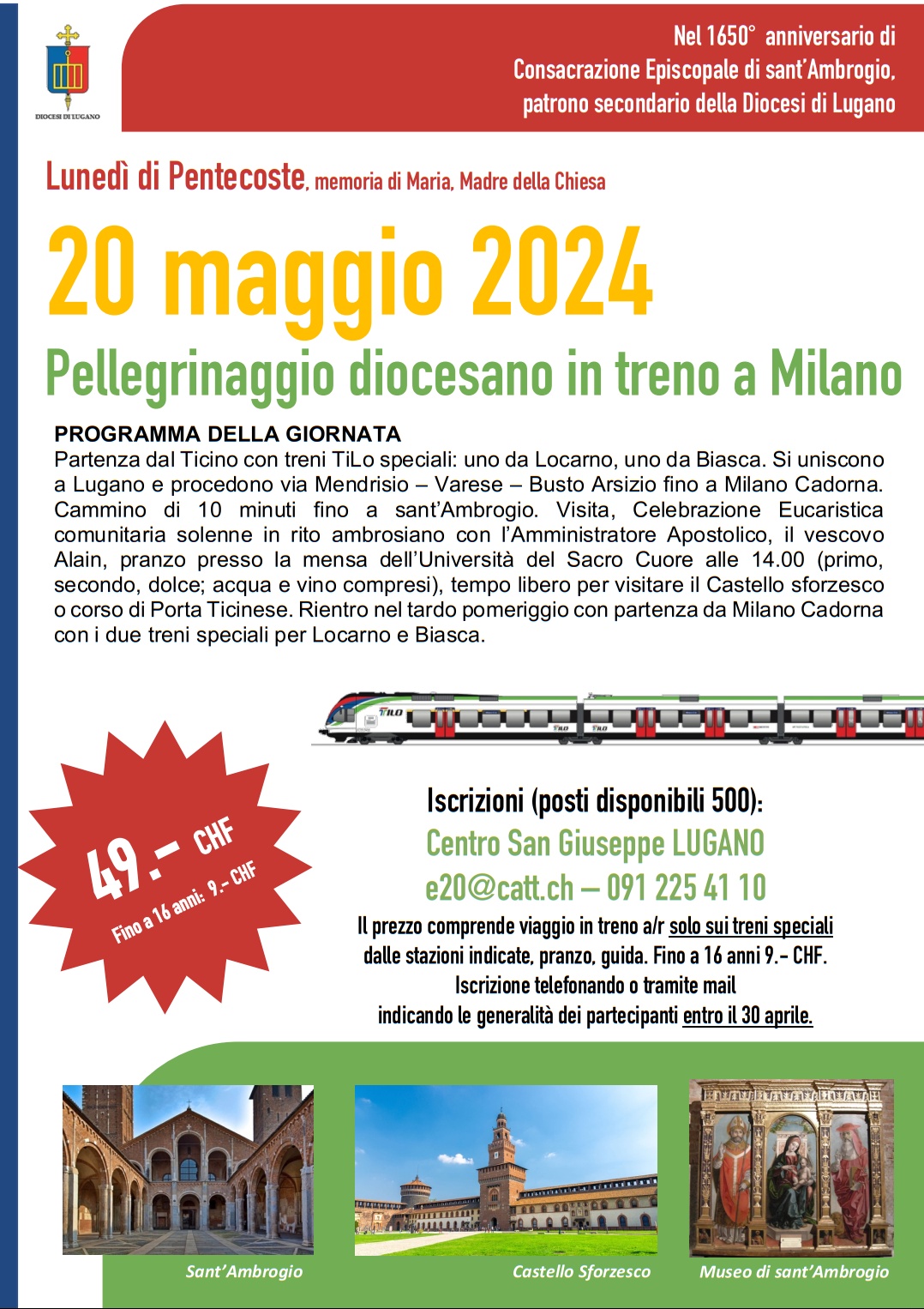Il prossimo 20 maggio, in occasione dei 1650° anniversario dalla consacrazione di Sant'Ambrogio a Vescovo di Milano, la Diocesi di Lugano organizza due treni speciali per raggiungere la Basilica milanese dedicata al Santo. I due ETR.524 di TiLo partiranno da Biasca e Locarno per raggiungere, dopo essersi agganciati a Lugano, e percorrendo la linea Stabio - Varese - Busto Arsizio, Milano Cadorna. Qui i convogli attenderanno il gruppo di pellegrini.