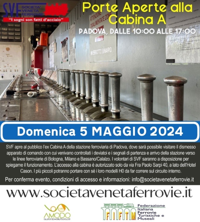 L'associazione Società Veneta Ferrovie APS, domenica 5 maggio dalle 10:00 alle 17:00, apre le porte dell'ex Cabina A della stazione di Padova (Via Fra' Paolo Sarpi, 40).