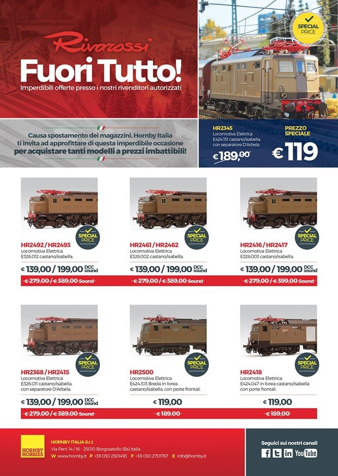 Nei negozi di modellismo a breve sarà possibile acquistare tre differenti versioni di E.424 a 119,00 Euro (anziché 189,00) o ancora la E.326 in quattro diverse versioni e numerazioni al prezzo speciale di 139,00 Euro in analogico (anziché 279,00) e 199,00 Euro per la versione sound (anziché 389,00).