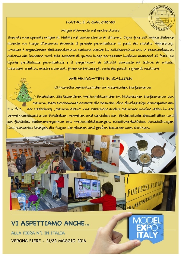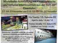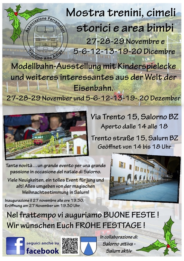L'Associazione Ferramatori Trentino Alto Adige organizza tra novembre e dicembre una mostra trenini, cimeli ferroviari storici, fabbricati in miniatura e area bimbi in via Trento 15 a Salorno (BZ).