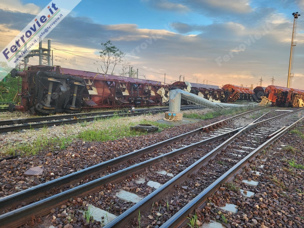 BORGO MANTOVANO (Mantova) - L'ondata di maltempo che ha colpito la bassa Lombardia nel pomeriggio del 16 maggio ha causato molti danni, anche in ambito ferroviario. Nello scalo di Poggio Rusco la tempesta ha colpito e rovesciato almeno una dozzina di carri tramoggia a carrelli, fermi nell'impianto in quel momento.