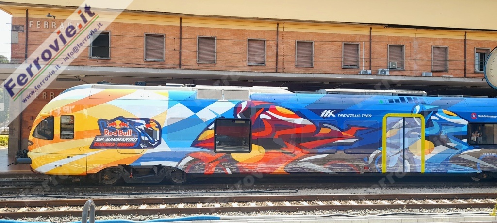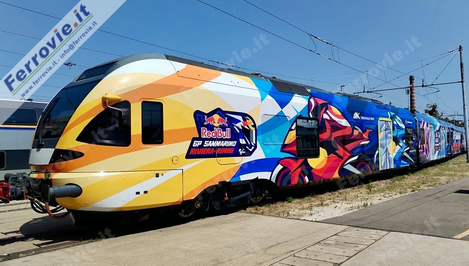 BOLOGNA - Cresce il numero dei convogli di Trenitalia che ricevono livree personalizzate per sponsorizzare eventi sportivi. L'ultimo in ordine di tempo è l'ETR.350-113 di Trenitalia Tper, che ha ricevuto un'accattivante coloritura personalizzata dedicata al Gran Premio Red Bull di San Marino e della Riviera di Rimini. L'evento si terrà nel circuito di Misano nel weekend del 6-8 settembre; oltre questa data, è programmata una seconda gara per il 22 settembre, che prenderà il posto del GP del Kazakistan annullato.