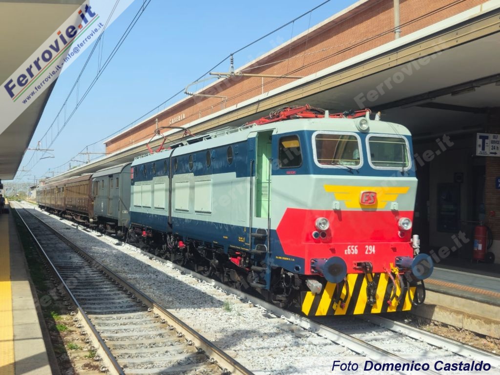 CASERTA - Sabato 7 settembre per la prima volta la locomotiva elettrica E.656.294 ha trainato un treno storico in servizio ordinario per la Regione Campania. Si tratta del "Caimano" recentemente consegnato a Fondazione FS dopo il ripristino della livrea storica, ma in attesa di interventi correttivi di natura estetica (vedi Treni storici del 05/09/2024).