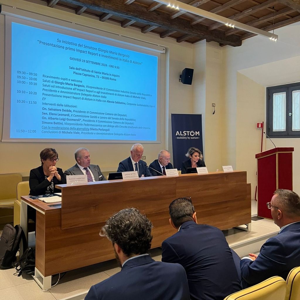 Il contributo alla crescita e allo sviluppo sostenibile di Alstom in Italia è stato analizzato nell'Impact Report condotto da EY, presentato in data odierna, 19 settembre, nella sala ISMA (Istituto di Santa Maria in Aquiro) del Senato della Repubblica a Roma. L'evento ha visto la partecipazione del Sen. Giorgio Maria Bergesio, Vicepresidente IX Commissione Industria Senato della Repubblica, rappresentanti delle istituzioni, fra cui l'On. Salvatore Deidda, Presidente IX Commissione Camera dei Deputati, la Sen. Elena Leonardi, X Commissione Sanità e Lavoro del Senato della Repubblica, l'On. Alberto Luigi Gusmeroli, Presidente X Commissione Camera dei Deputati, Simone Bettini, Vicepresidente Federmeccanica con delega alla Crescita strutturale delle Imprese, Alesia Sabbatino, Corporate Sustainability Expert di EY, oltre a Michele Viale, Direttore Generale di Alstom in Italia, e alla giornalista Diletta Parlangeli, che ha moderato gli interventi.